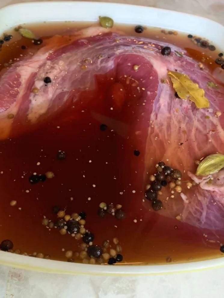 - After 5-10 days of brining, when you are ready to cook, rinse the spices off the meat and discard. Pat the meat dry and set aside.